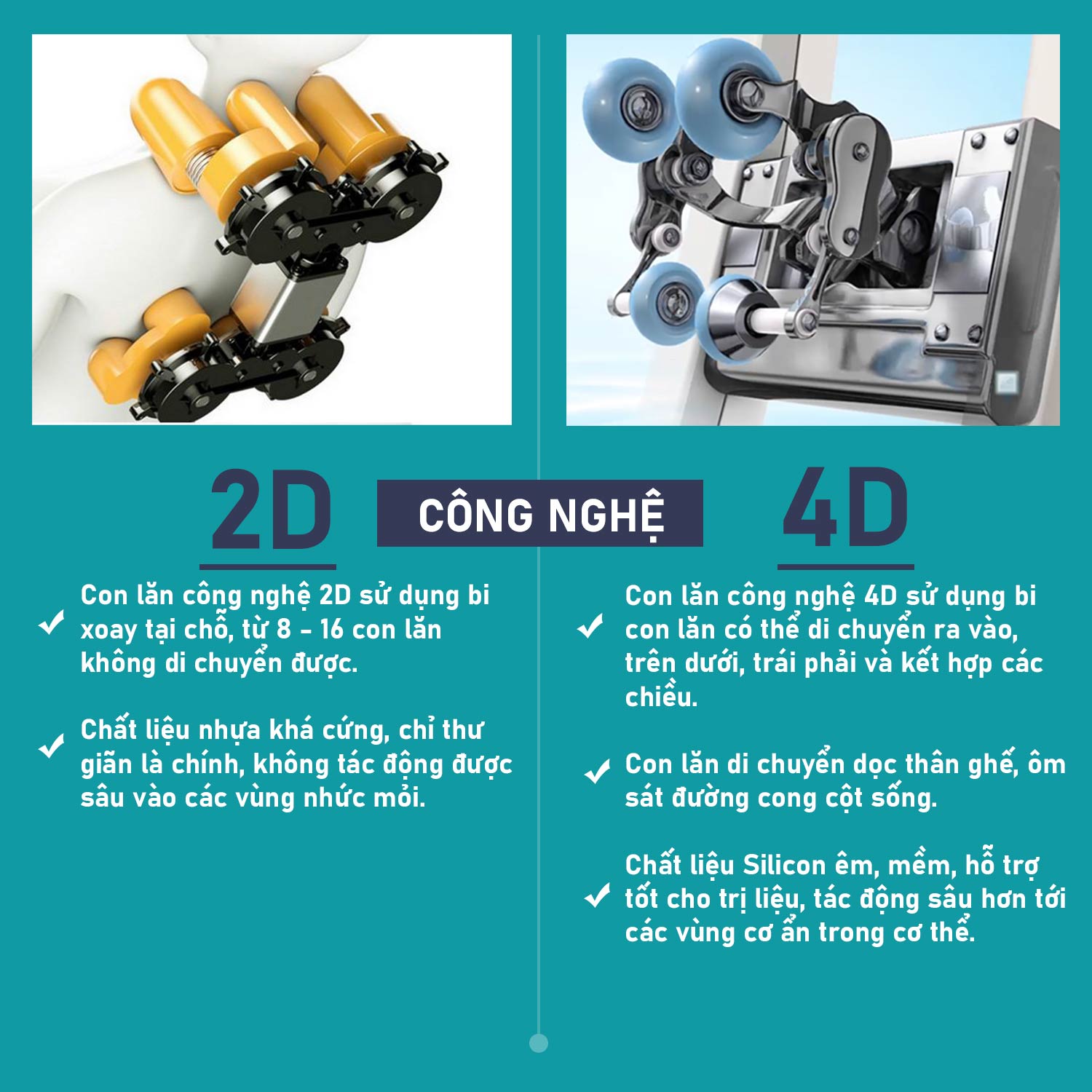 - 4D: Con lăn di chuyển 3 chiều trái/phải, trong/ngoài, trên/ dưới và kết hợp các chiều massage. Công nghệ này giúp mô phỏng chân thực nhất động tác của bàn tay con người với các động tác như: Đấm, day, xoa, ấn, gõ, vỗ miết…