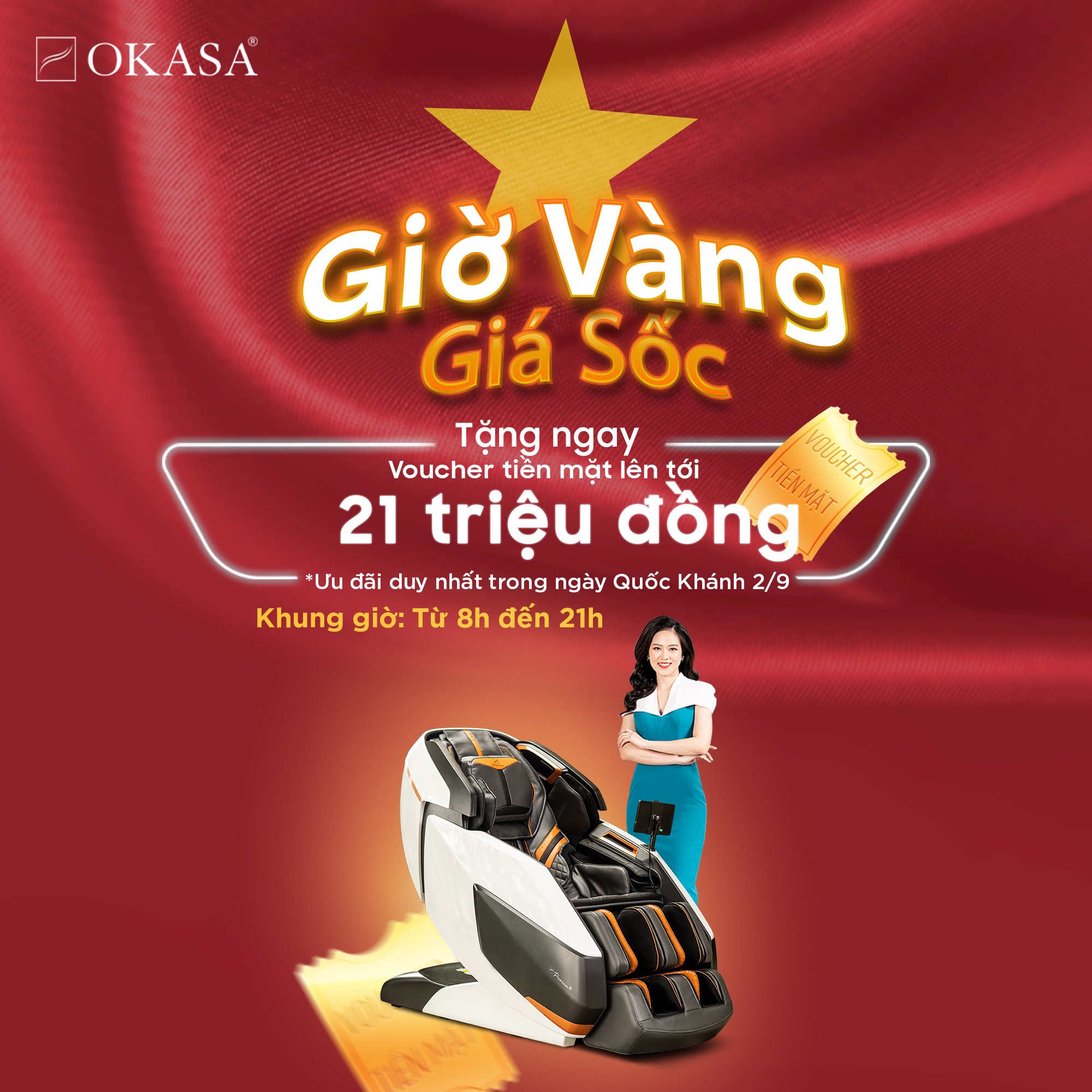 Nhân dịp Quốc khánh 2/9 - Okasa gửi tặng chương trình ưu đãi cực lớn “ Giờ VÀNG giá SỐC” với tổng giá trị tiền mặt lên đến 21 triệu đồng( Tùy theo phân khúc ghế) chỉ DUY NHẤT hôm nay trong khung giờ: