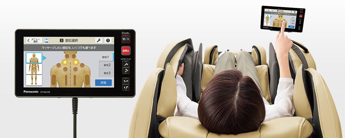 Bảng điều khiển cảm ứng mới của Panasonic EP-MA102 cho phép vận hành dễ dàng bằng cách chạm vào màn hình. Với 164 kỹ thuật xoa bóp, giờ đây thật dễ dàng để chọn các chương trình và vị trí muốn massage hướng đến sự thoải mái. Bạn có thể ghi nhớ chương trình yêu thích phù hợp với cơ thể